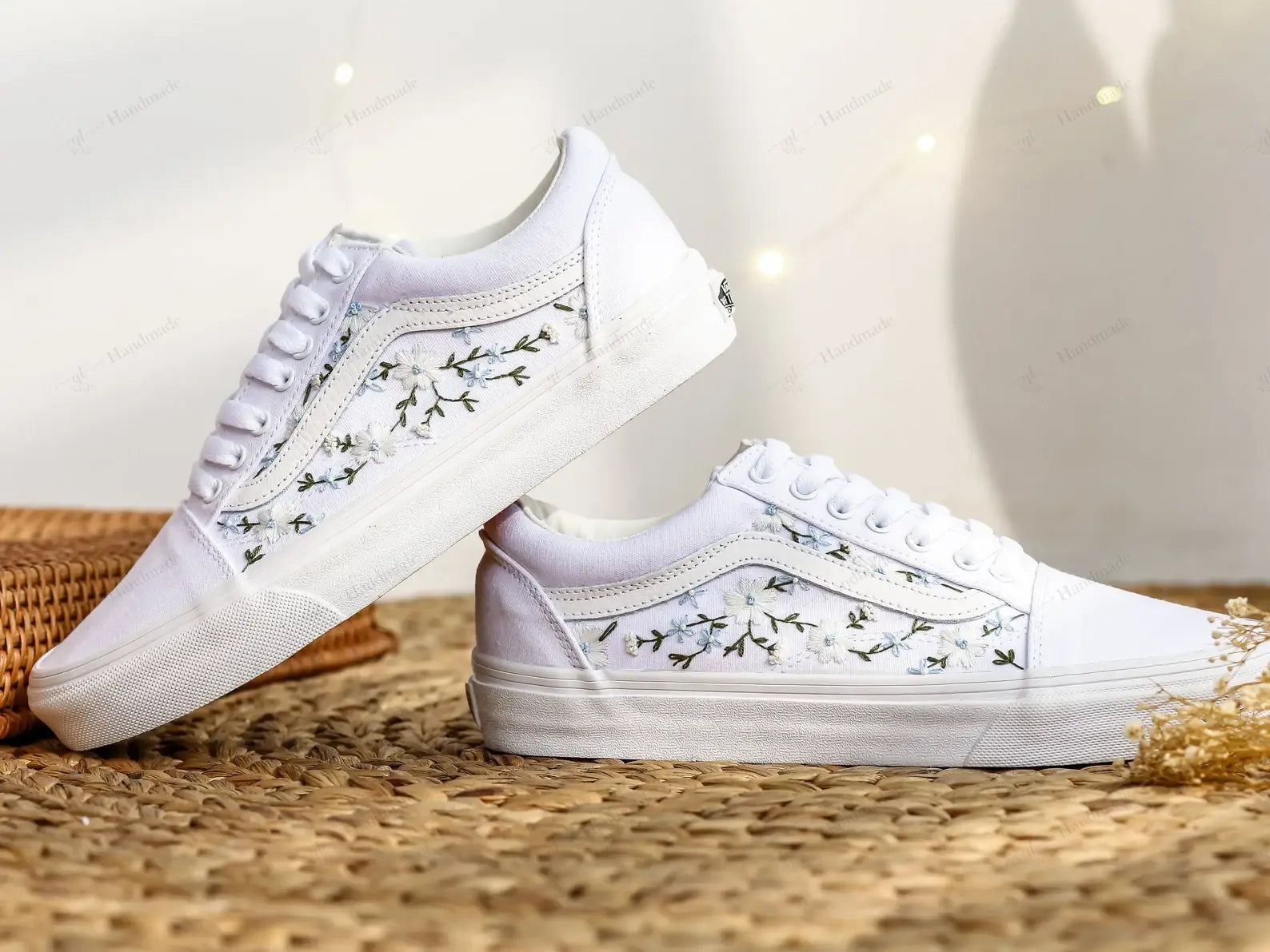 Light Blue & White Flowers Wedding Flowers Hand-Embroidered White Vans Low Top
