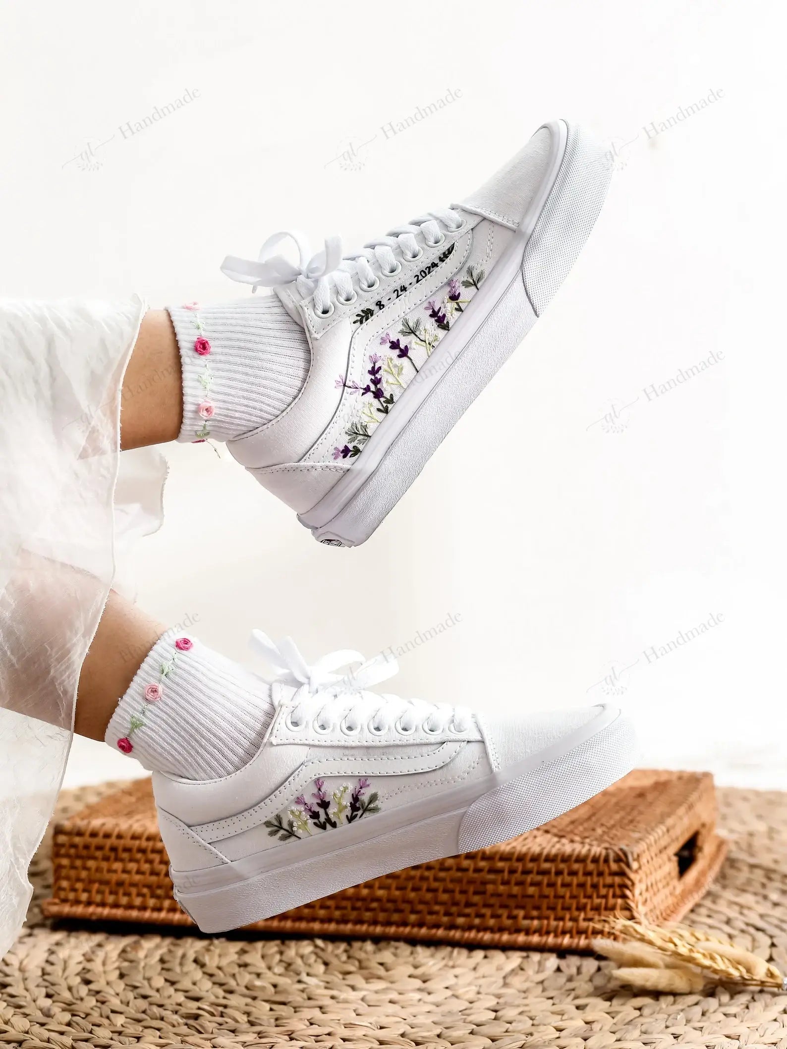Lilac Light Purple Flowers Wedding Sneaker Hand-Embroidered White Vans Low Top Bride Shoes